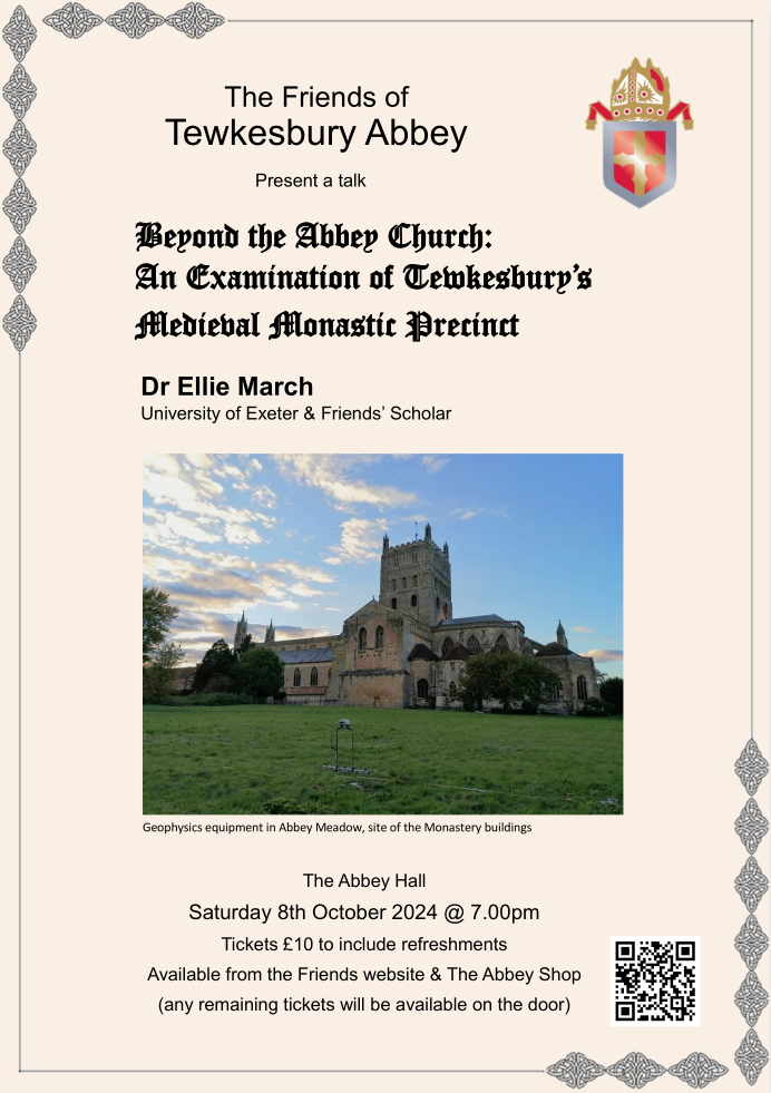 On 8th October The Friends’ Scholar, Dr Ellie March, presented to The Friends an introduction to the findings of her studies into Tewkesbury’s Medieval Monastic Precinct undertaken for her PhD thesis. The talk focused on the early development of the site and the relationship between the Abbey and the town. The audio recording of the talk is available below, which includes the introduction from Vice-President of The Friends, Mr Graham Finch.